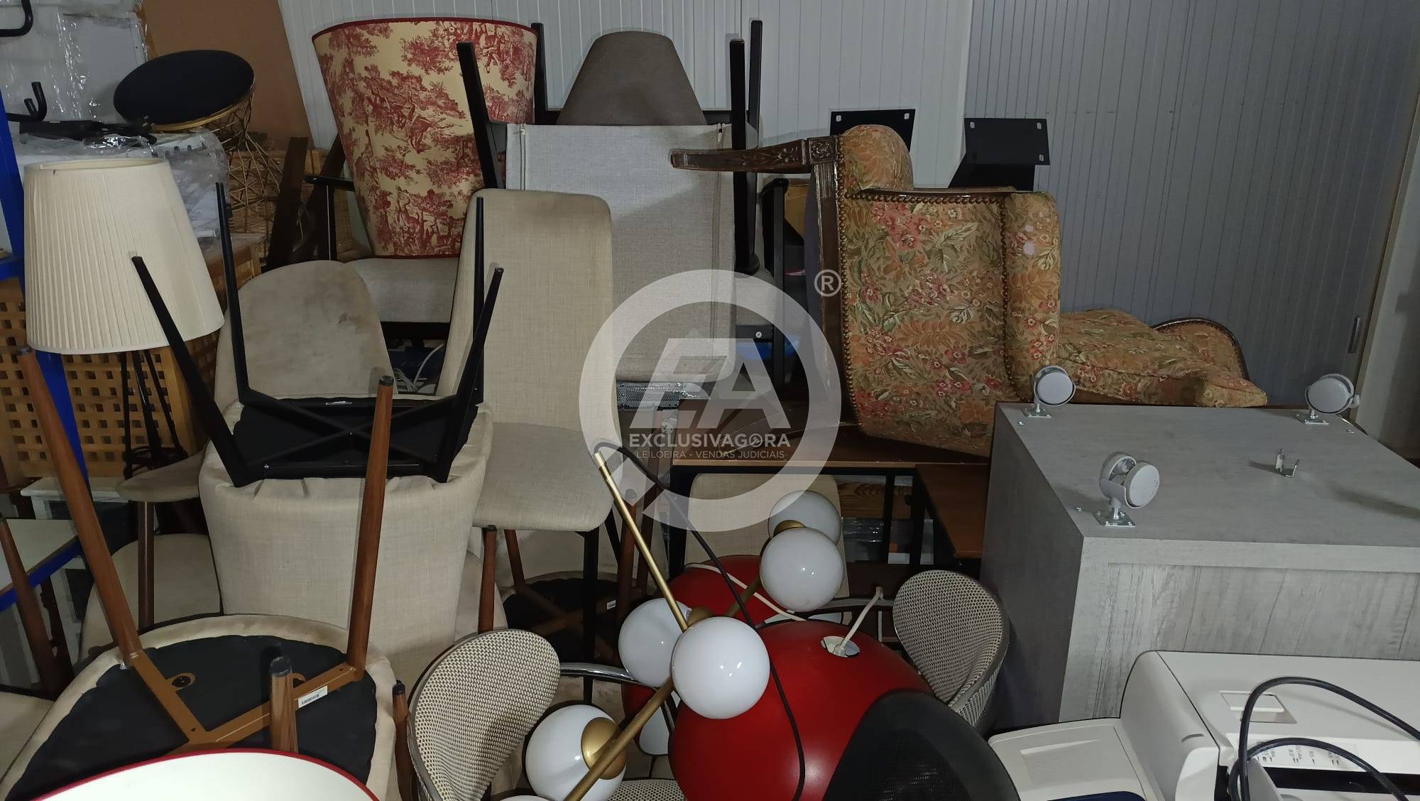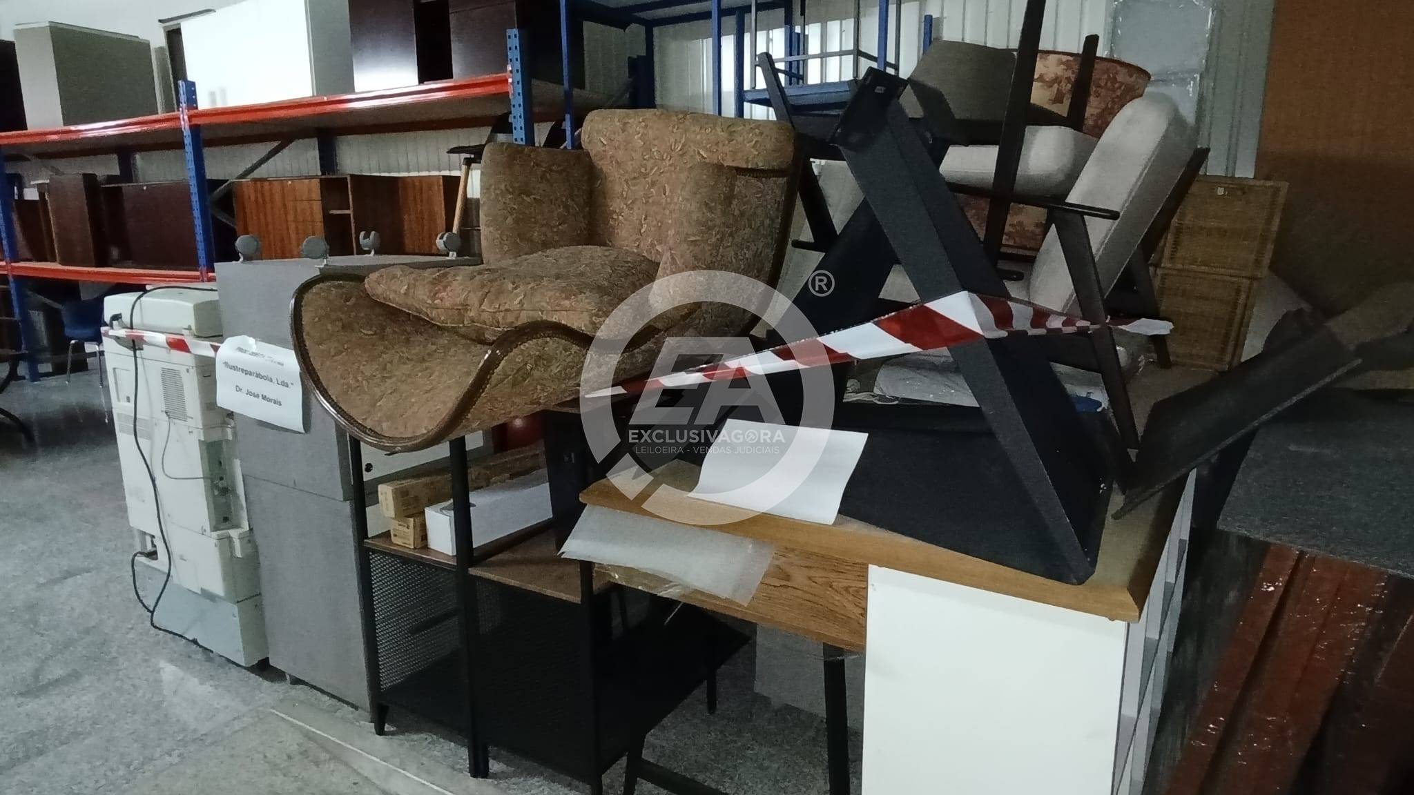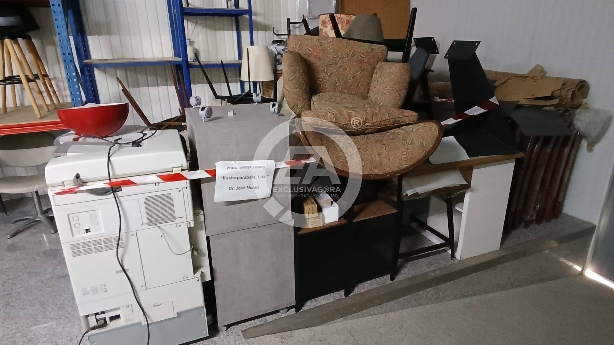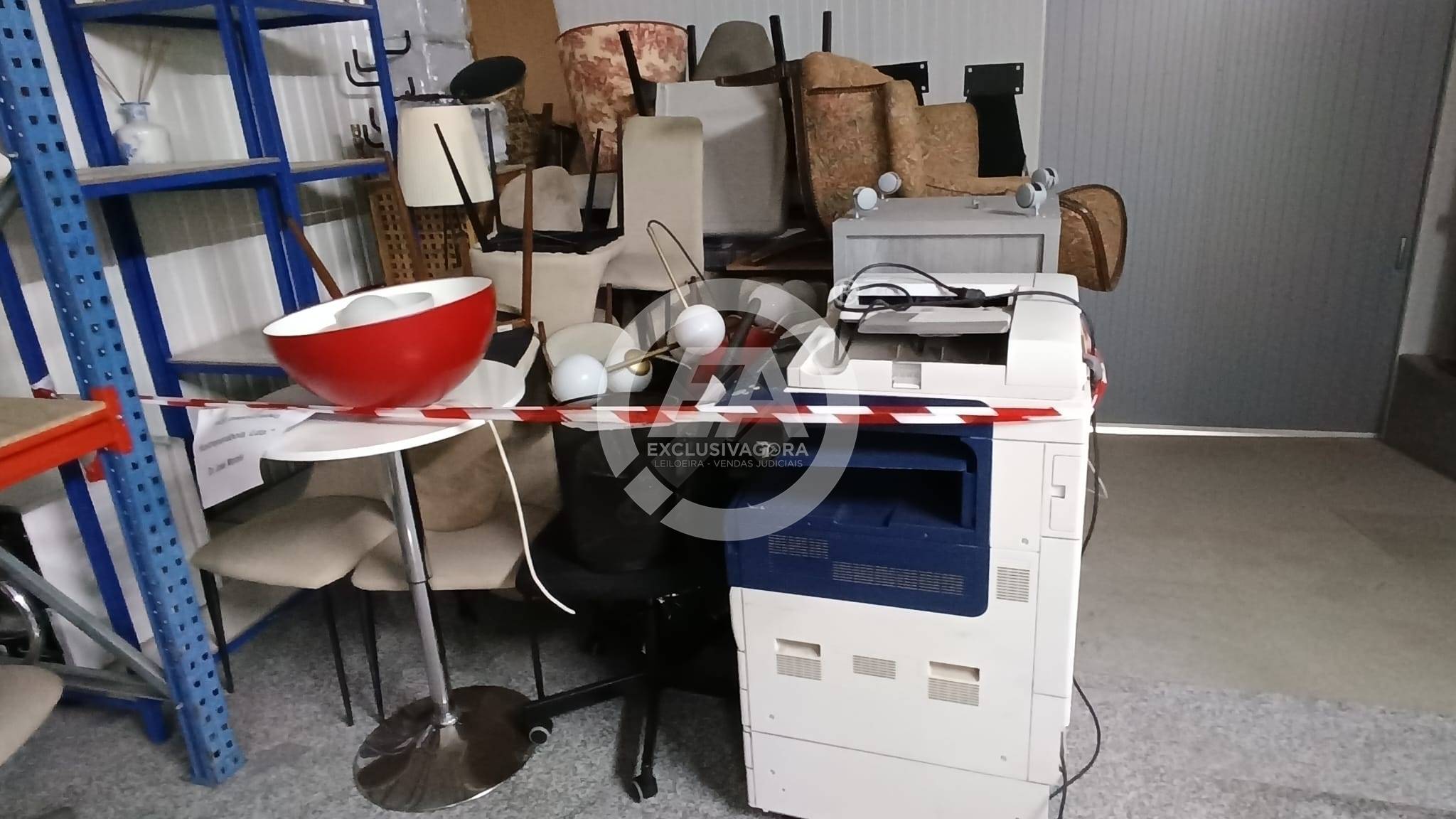 Lote de Material de Escritório composto por 1 mesa de reuniões; 1 estante com 4 módulos; 16 cadeiras; 1 vaso; 1 cadeirão; 1 poltrona de 2 lugares; 2 bancos de bar ajustáveis; 1 mesa de bar; 2 mesas redondas; 1 candeeiro abajour de pé alto; 1 secretária; 1 cadeira c/ rodas; 1 estante com 8 módulos; 1 monitor c/ CPU, teclado e rato; 1 impressora; 1 telefone; 1 caixote de lixo; 1 candeeiro abajour de mesa; 2 gaveteiros; 2 candeeiros de leitura; 7 quadros de parede; 3 tapetes; 4 candeeiros de teto; 1 micro-ondas; 1 mini frigorifico; 1 máquina de café; 1 TV Led Panasonic; 1 trituradora de papel; 2 aquecedores Kunft e 1 sofá de um lugar.