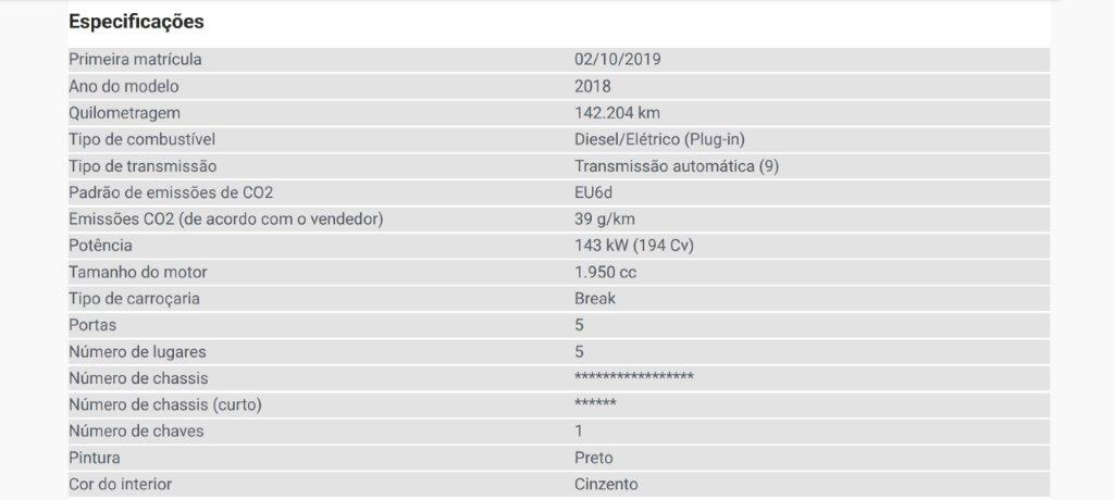 Ligeiro de passageiros, com matricula BM-15-VP, da marca Mercedes-Benz, modelo C300 de, a Diesel/Elétrico (Plug-in), com a cor Preto, do ano 2019, com 148017 kms e 5 lugares.